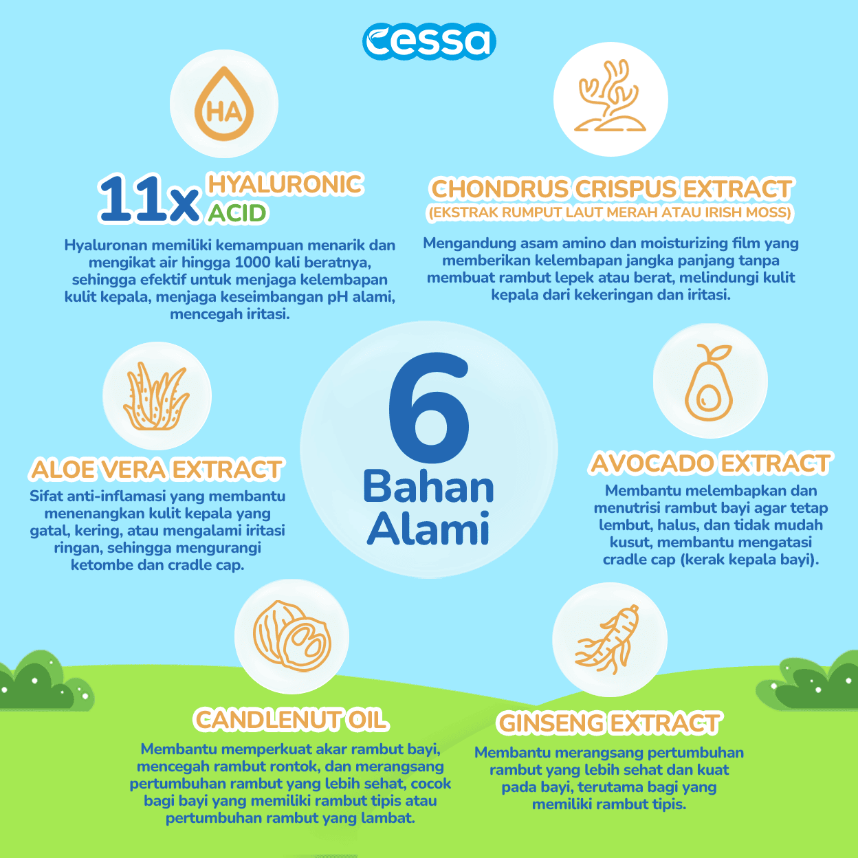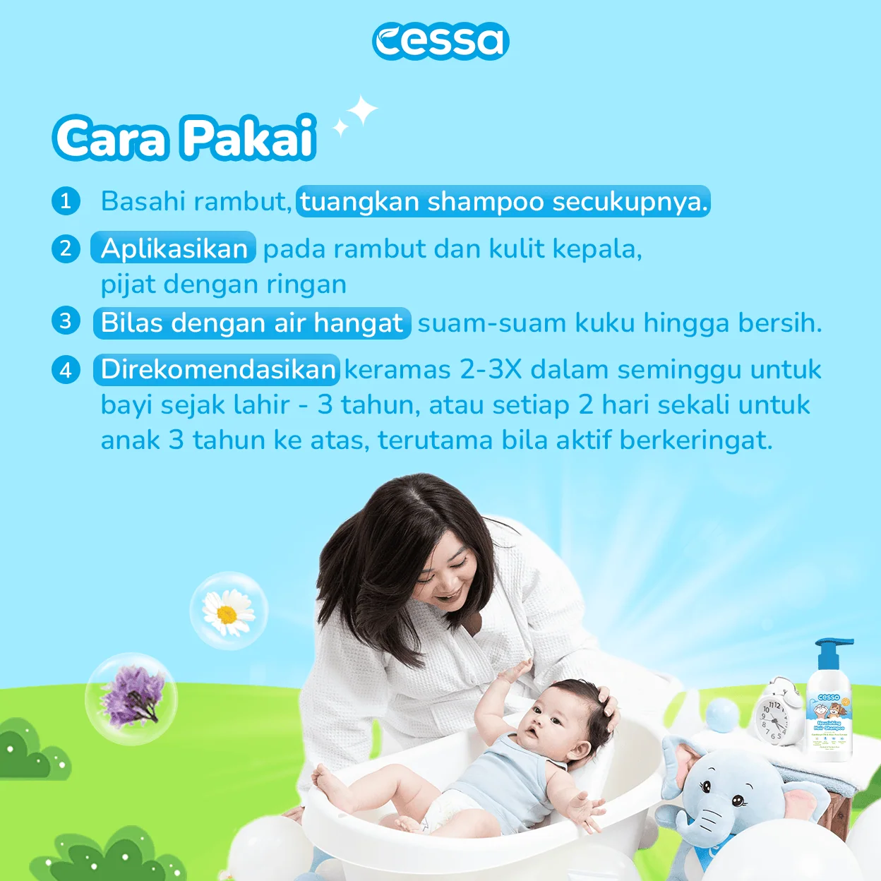 Cessa Nourishing Hair Shampoo diformulasikan dengan Molecular Scalp Barrier Technology dan 4X Growth Support Booster Formula untuk merawat kulit kepala yang tipis dan sensitif, menjaga kebersihan rambut secara menyeluruh, serta mendukung pertumbuhan rambut yang sehat. Diperkaya dengan 11x Hyaluronic Acid & Ekstrak Avocado untuk membantu melembapkan, menghaluskan, dan membuat rambut anak lebih mudah diatur serta tampak berkilau.